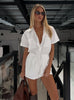 - Classic collar, button closure, waist tie fastening, twin hip pockets, cap sleeves, straight hem