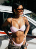 - Printed design, fixed coverage, adjustable straps, clasp closure at back