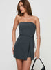 - Silicon strip, belted waist, split hem, invisible zipper on side, shirred back, built-in shorts