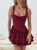 - Pinched bust, tiered hem, diagonal waist shape, invisible zip fastening at side, fixed straps, tie fastening at back