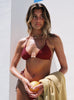 - Ruched, adjustable coverage, removable pads, tie back closure